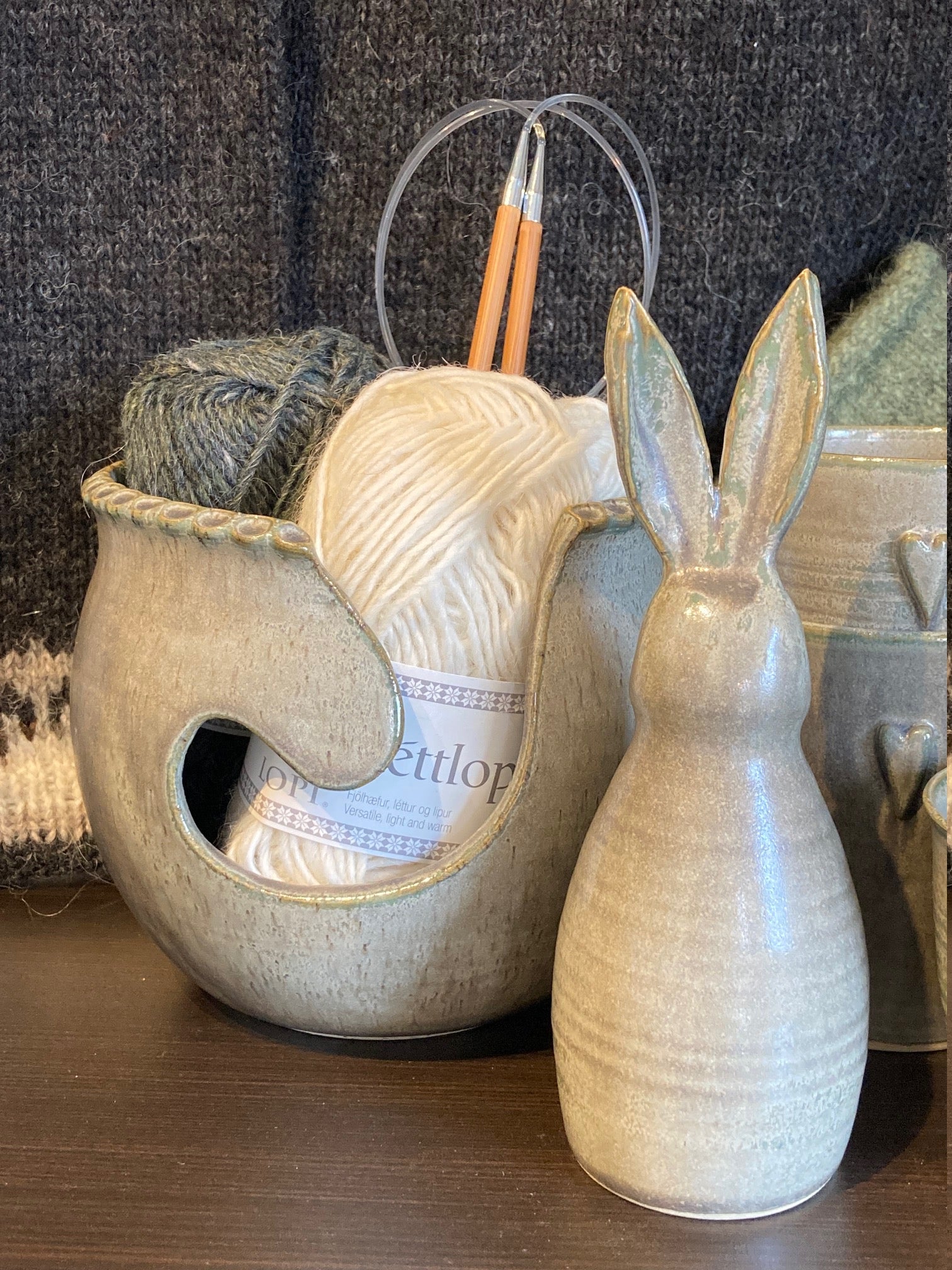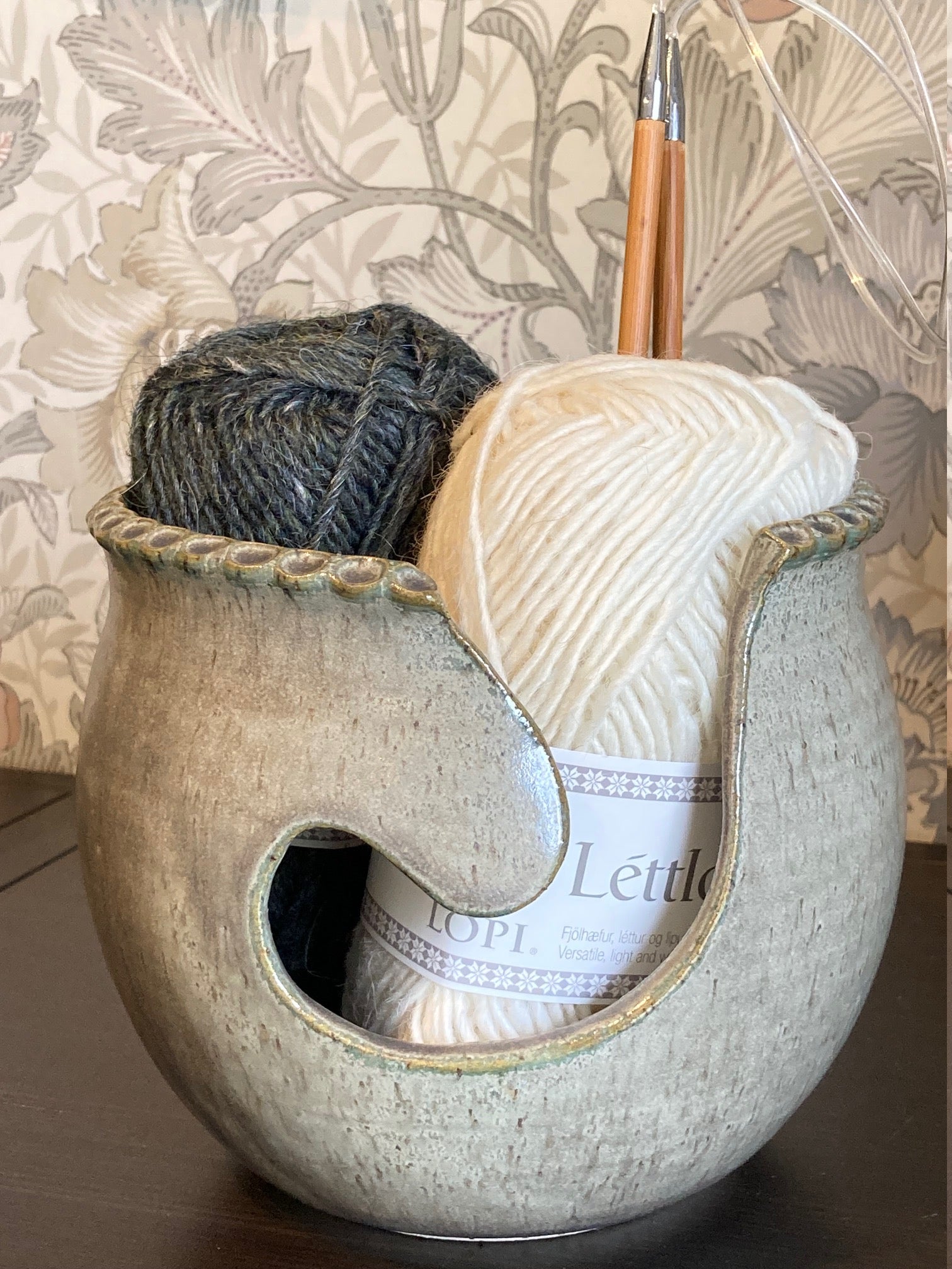 Drejad garn- stickskål i stengodskeramik.